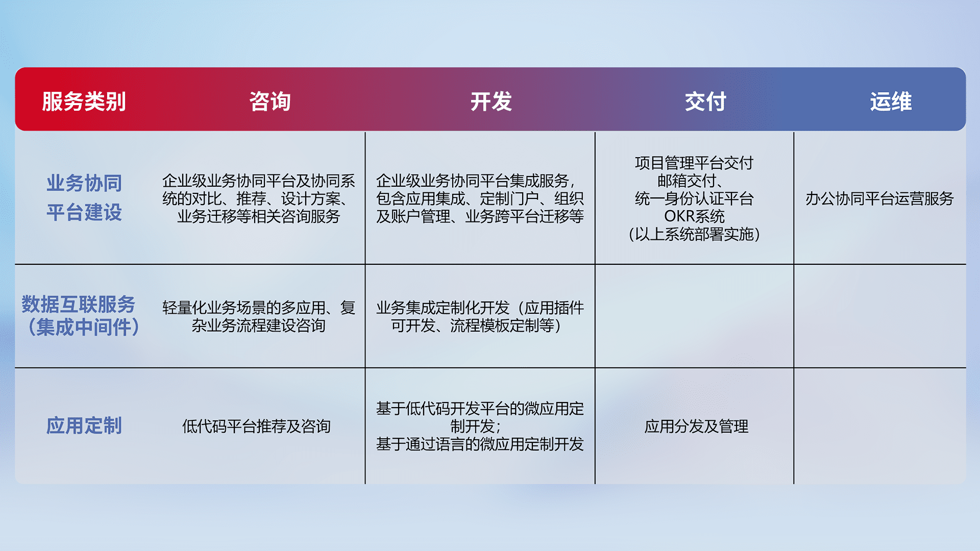 针对钉钉、、企微、、、IDaas等平台级产品提供产品的规划、、方案、、交付、、、定制化开发等服务,,,,实现如统一协同办公、、、智能客户服务、、混合会议管理、、、智能数据查询、、等业务场景,,实现数字化转型。。。。